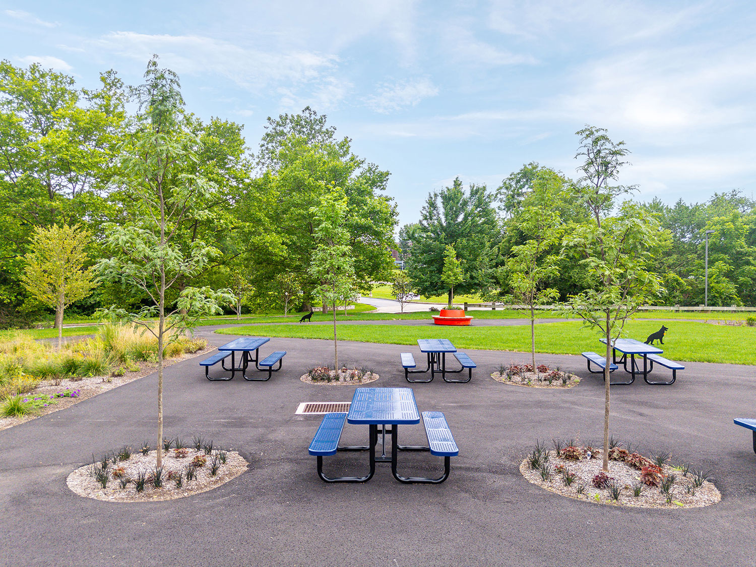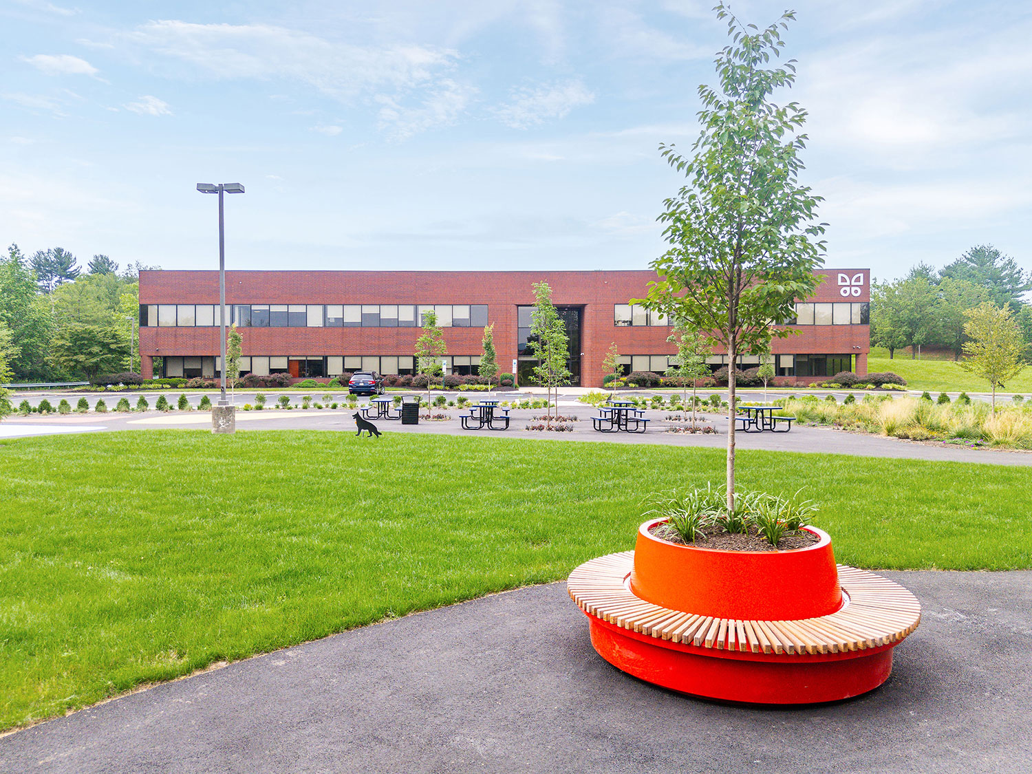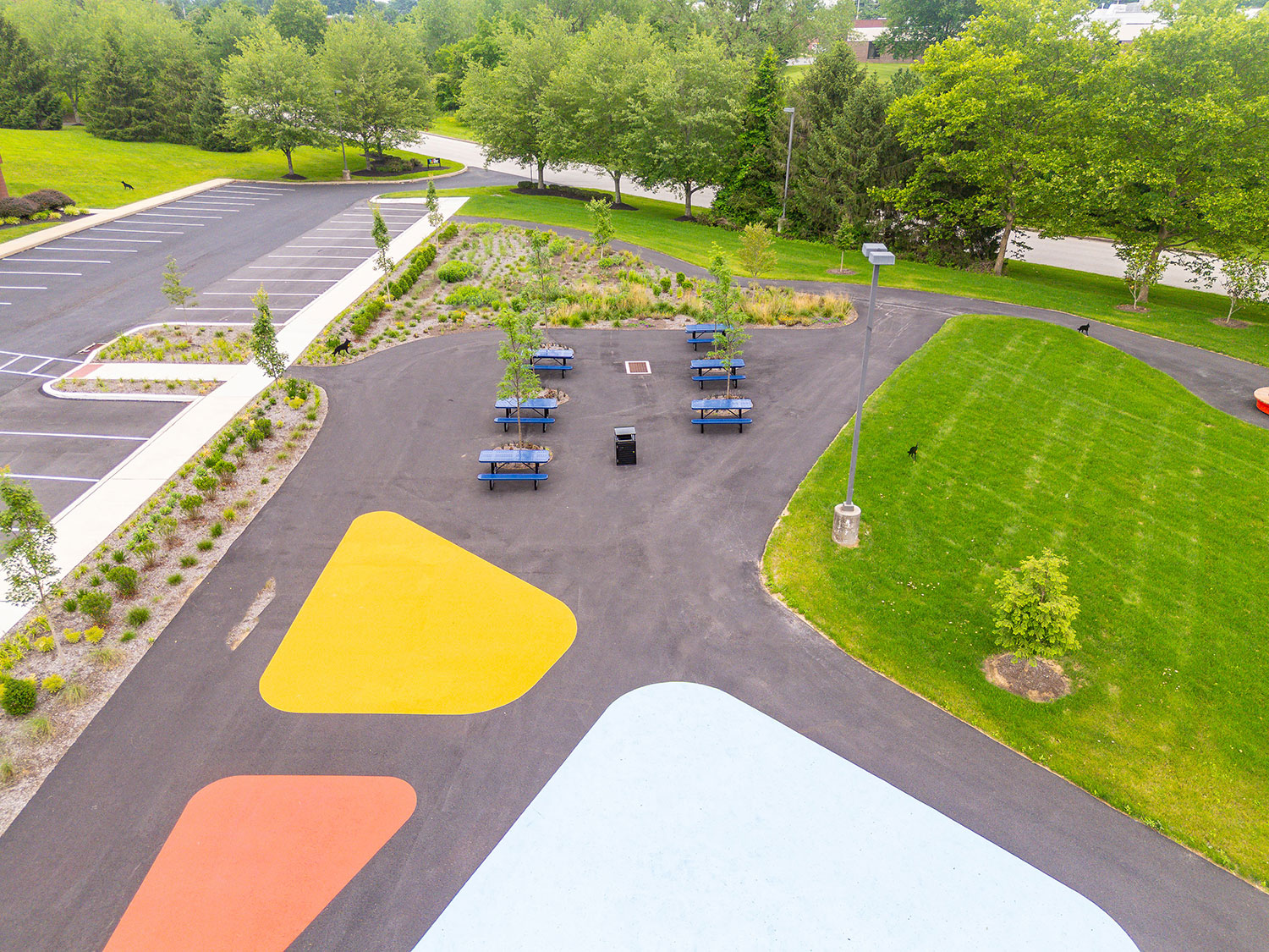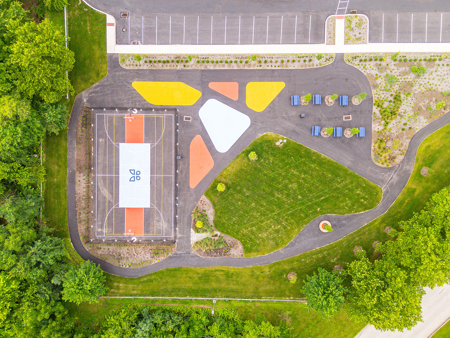 Transformed a previously underutilized parking lot into a vibrant green space featuring lush landscaping with trees for shade and visual appeal. Installed circular planter benches surrounding new trees that serve as both seating and greenery containers, enhancing usability and aesthetics. Integrated paved walking paths throughout the area to provide ADA accessibility to the areas. Added a full-size basketball court