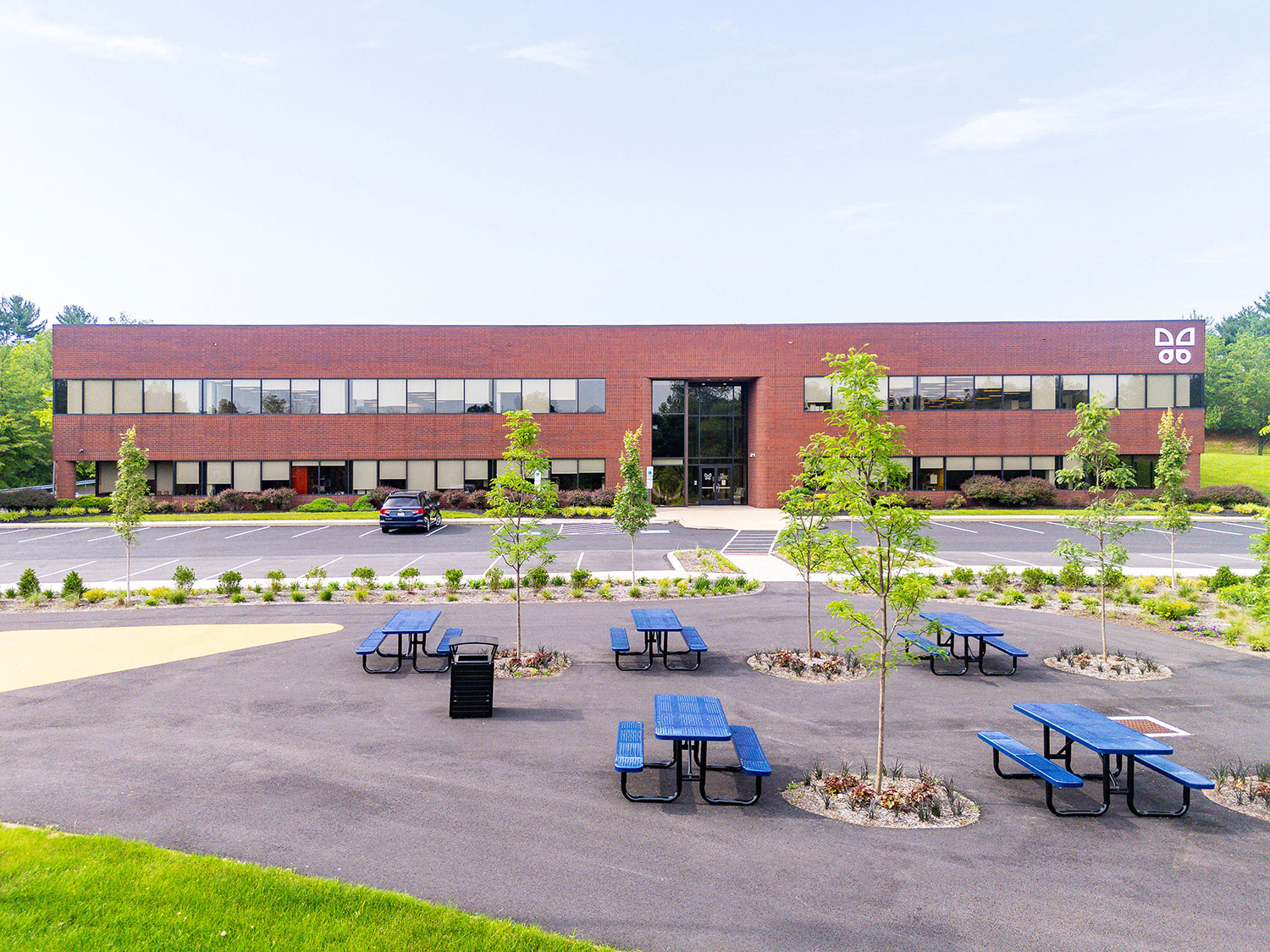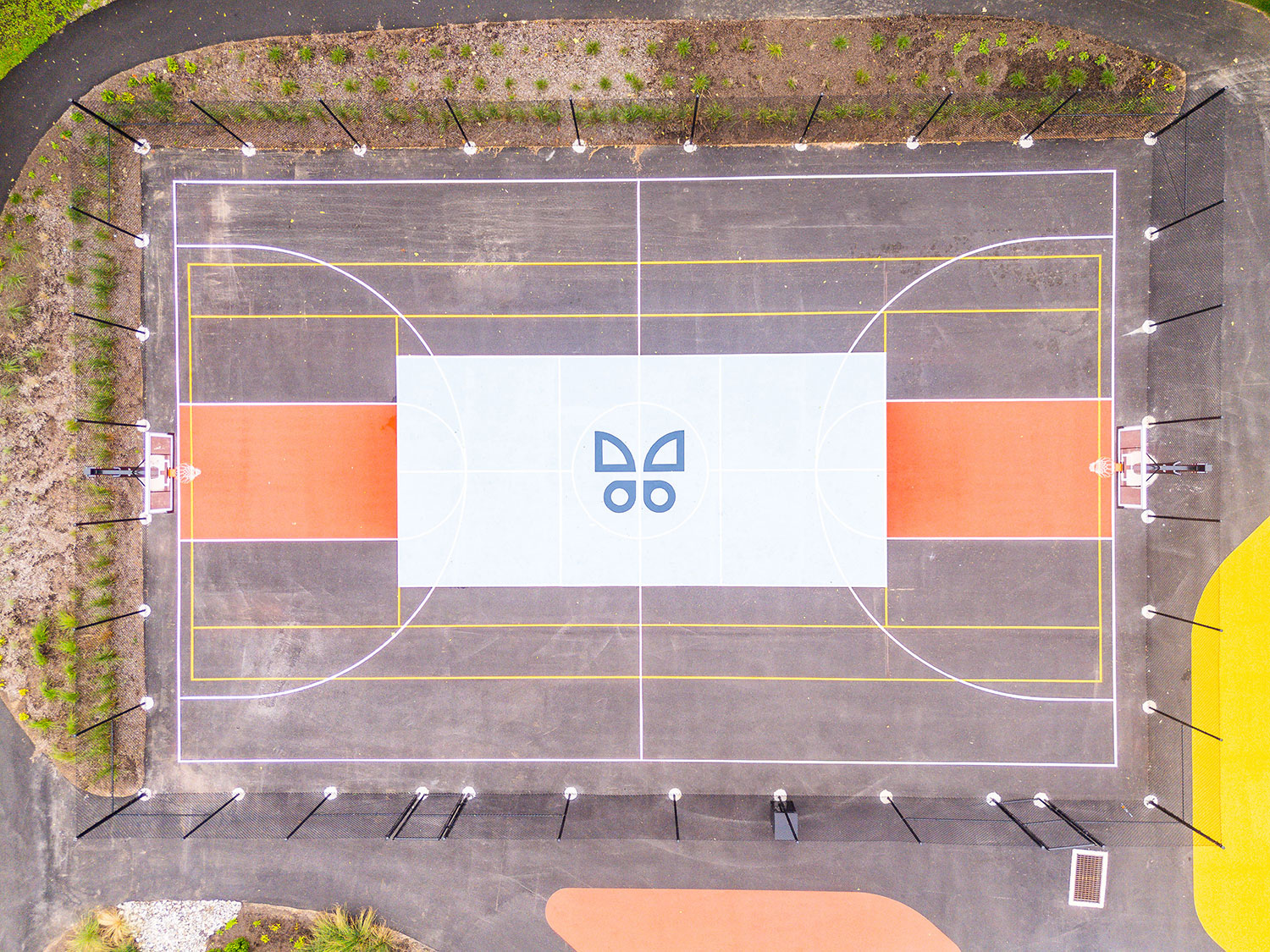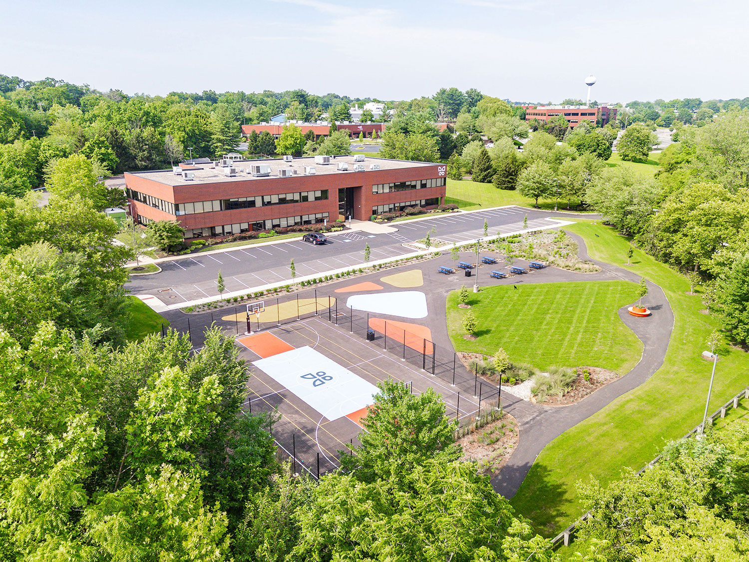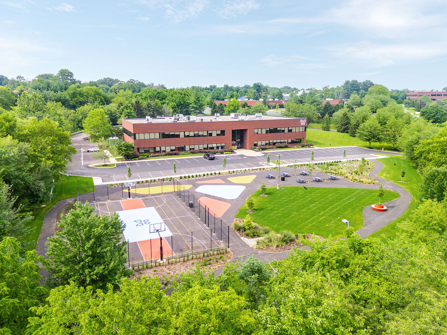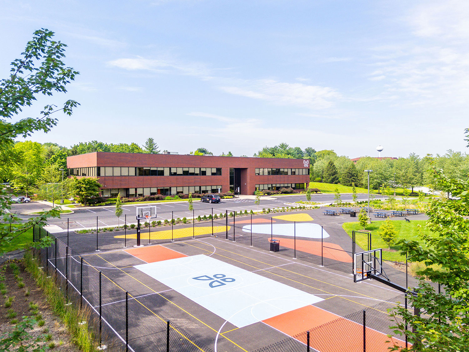 Transformed a previously underutilized parking lot into a vibrant green space featuring lush landscaping with trees for shade and visual appeal. Installed circular planter benches surrounding new trees that serve as both seating and greenery containers, enhancing usability and aesthetics. Integrated paved walking paths throughout the area to provide ADA accessibility to the areas. Added a full-size basketball court